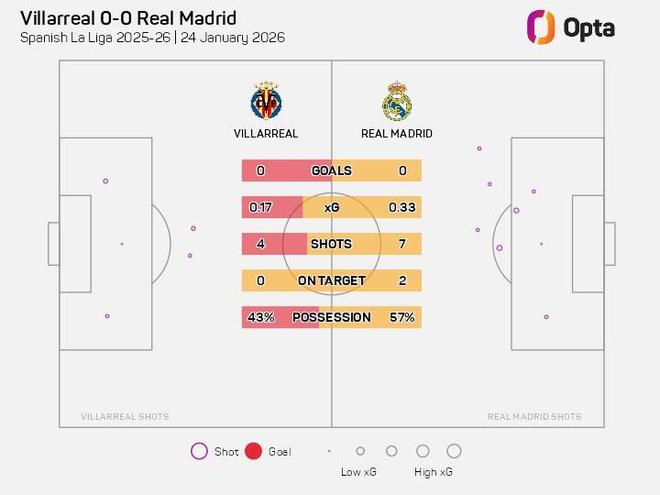 此役客場(chǎng)對(duì)陣比利亞雷亞爾,皇家馬德里完成7次射門,2次射正,而對(duì)手完成4次射門,無(wú)一射正。